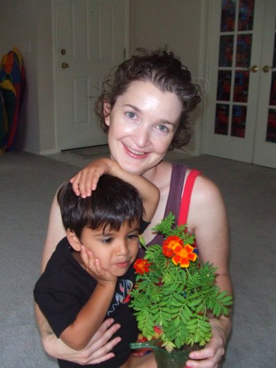 Duncan's class planted flowers in detergent scoops that looked like little wagons for Mother's Day presents. On Mother's day they were just small sprouts. I've been watering mine and we finally got some flowers. I have no idea why Duncan is holding his head like that.